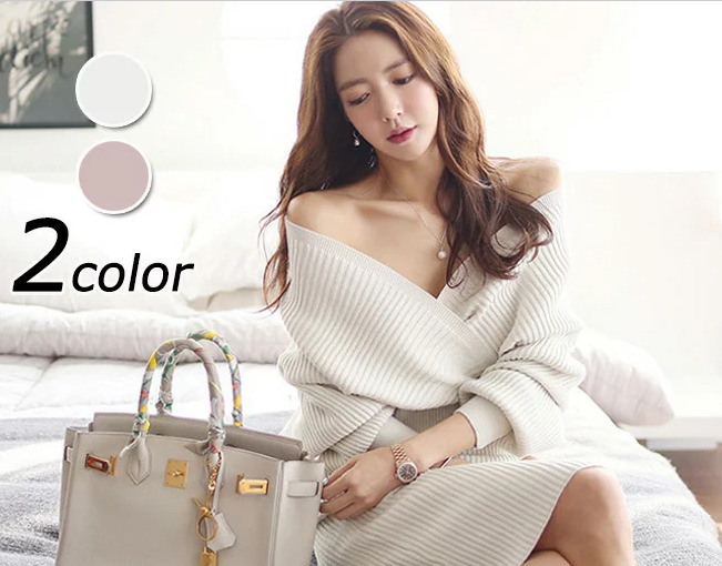 ウエストやヒップを絞ったオフショルニットで、メリハリのあるボディラインを強調しましょう。